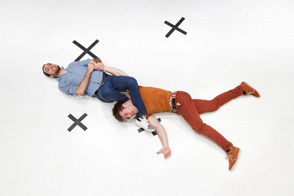 With a wink of an eye, the two guys are fighting to death. Then, a second wink and they're both laughing their heads off.