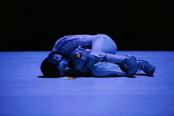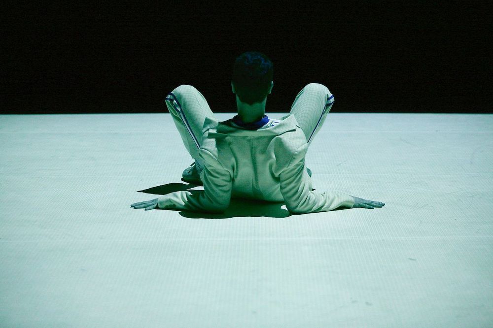 Un homme seul, couché, inscrit dans un rectangle vert électrique. Espace-temps indéfini. Un cœur qui pousse, un corps qui cherche. Soulever la mécanique, se dresser, avancer sur des éclats de sons. Par la tête, le bassin, ou les pieds. Tel un homme suspendu au sol qui rêve de marcher en l’air. D’impasses en résolutions, il tente, se trompe, tombe, se risque à nouveau, repoussant toujours plus loin les limites de l’espèce. Tantôt méduse inversée aux tentacules fragiles, tantôt crocodile glissant sans bruit, l’étrange créature s’érige peu à peu sur ses pieds neufs, Icare sans ailes, sorte de cyborg découvrant son double…