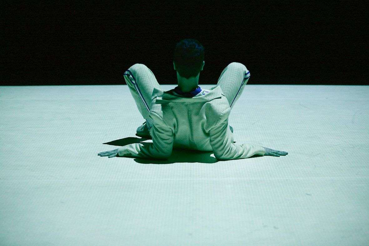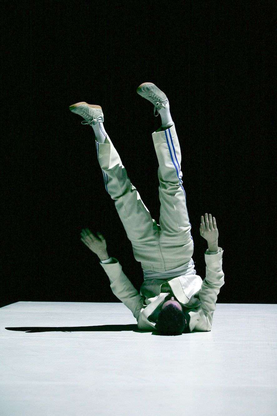A lone man, lying down in the space of an electric green rectangle. Undefined space and time. A growing heart, a body who searches. To lift the mechanics, to raise, move on sound bursts. By the head, the pelvis or the feet. Like a man suspended to the ground and who dreams of walking in the air. From deadlocks to resolutions, he tries, fails, falls, risks again, pushing ever further the species limits. Sometimes an inverted jelly fish with fragile tentacles, sometimes a crocodile, sliding silently, the strange creature erects itself on its new feet, as a wingless Icarus, a kind of cyborg discovering its twin…
